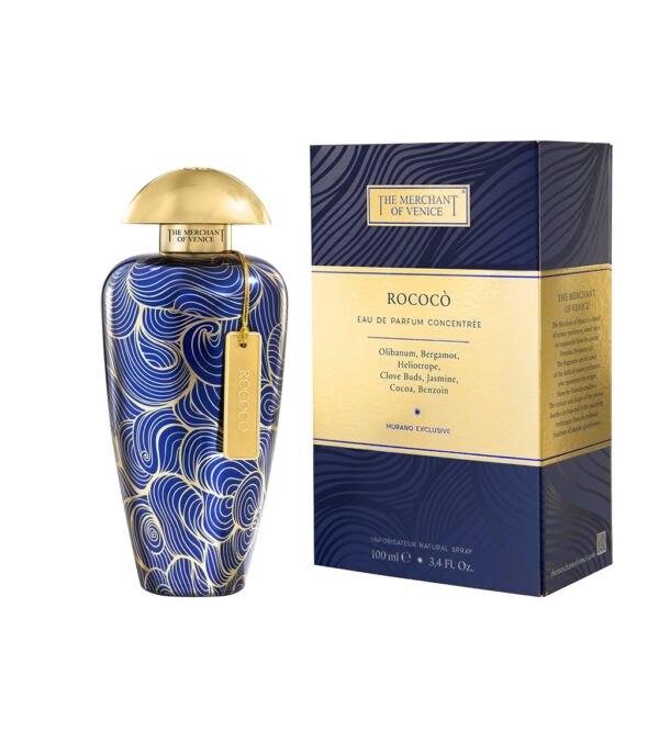 The perfume Rococo’ is confined in a sophisticated flacon made in typical venetian blue and gold colours. It reinterprets the most classic shape of Murano glass design showing a characteristic pattern inspired in the artistic style in interior design, from which Venice is the greatest representative of Italy. The style is reinterpreted with golden lines that create a light airy impression on the surface of the flacon. Delicate and poetic like daydreaming. It is further embellished with a golden cup that shows the wind rose and a golden metal label showing the name of the fragrance, that hangs from the neck.